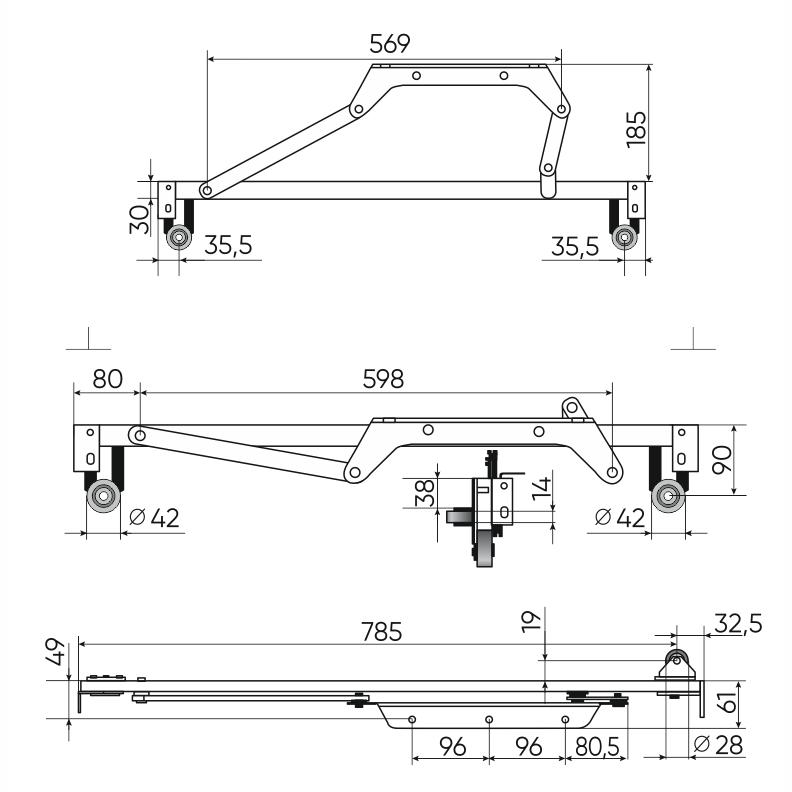 Наличие двух опорных колес снижает точечные нагрузки на пол, облегчает выкат и уменьшает износ напольных покрытий при регулярной трансформации. Вместо штатного синхронизатора допускается применение деревянного бруса, что упрощает конструктив и дает производителю больше свободы в проектировании каркаса.